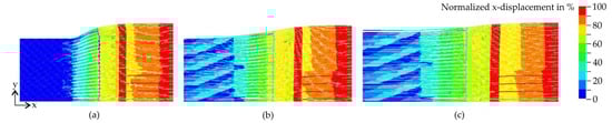 Simulation results of gradient fabric GW2: displacement of the warp yarns at different total strain values: (a) 10%, (b) 20%, and (c) 30%.