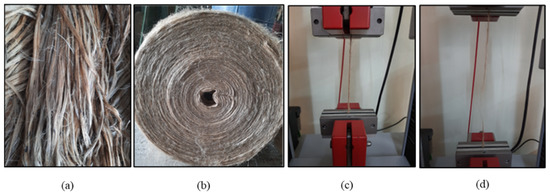 Figure 1. Experimental image; (a) raw jute fiber, (b) jute yarn sliver before spinning, (c) Testing of jute yarn using UTM machine and tearing of jute yarn after applying force (d).