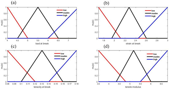 Figure 2. Triangular membership function for the input parameters; (a) load at break, (b) strain at break, (c) tenacity at break, and (d) tensile modulus.