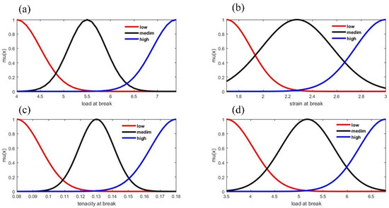 Figure 3. Gaussian membership function for the input parameters; (a) load at break, (b) strain at break, (c) tenacity at break, and (d) tensile modulus.