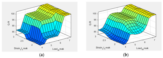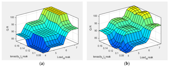 Figure 8 illustrates that the quality ratio remains low when LB and TB are at their minimum values for both the triangular and gaussian membership functions. However, the quality ratio increases significantly with the increase in load at break compared to the tenacity at break. For triangular and gaussian membership functions, quality ratio increases from 83.40 to 94.5 and 84 to 95.40 for raising the value of LB from 4.40 to 6.75, respectively.