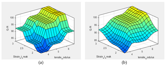 Figure 9. Surface view of tensile modulus (X-axis) and strain at break (Y-axis) effect on jute yarn quality (Z-axis); (a) for triangular membership function and (b) gaussian membership function.