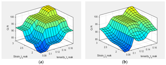 Figure 10. Surface view of tenacity at break (X-axis) and strain at break (Y-axis) effect on jute yarn quality (Z-axis); (a) for triangular membership function and (b) gaussian membership function.