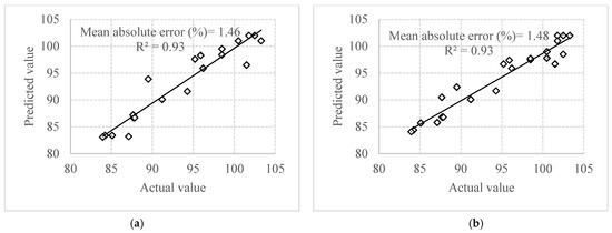 Figure 11. Correlation between actual and predicted yarn quality ratio using triangular membership function (a) and gaussian membership function (b).
