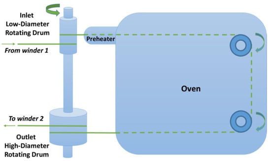 Three different filaments were produced, namely, pure PP, PP with 4 wt.% of the antioxidant masterbatch (PP-AO) and PP with 4 wt.% masterbatch of the antioxidant and 2 wt.% masterbatch of the compatibilizer (PP-AO-COMB). The non-drawn filaments, with a diameter in the range of 0.4–0.7 mm, were produced as described previously in detail [27,28,29]. Briefly, a first extrusion was performed in the twin-screw extruder with four heating zones operating at 190, 210, 215 and 220 °C at a motor speed of 25 rpm. The melt was cooled in a water bath (~15 °C). After pelletizing the obtained filaments, a second extrusion was performed in the single-screw extruder with three heating zones operating at 215, 225 and 210 °C and at a motor speed of 20 rpm. The obtained PP filaments were drawn, as described previously [27,28,29], at a ratio of 7 and drawing temperatures of 100, 110, 120, 130 and 140 °C. The filaments of PP-AO and PP-AO-COMB were drawn at a ratio of 7 and at a drawing temperature of 120 °C. Briefly, a homemade drawing apparatus was used. A sketch of the drawing apparatus is presented in Figure 1. In this machine, the drawing ratio is tuned by varying the ratio of the diameters of two rotating drums, attached to the same axis (thus, rotating with the same speed). The diameter of the first drum was 20 mm, and that of the second drum was 140 mm, resulting in a drawing ratio of 7. The fibers before entering and after exiting the drawing oven were heated with air at 120 °C in order to avoid an abrupt alteration of the samples’ temperature, which could lead to undesirable internal stresses. The fiber before entering the drawing process was collected in the winder 1. After drawing, the fiber was collected in another winder (the two winders are not shown in the sketch). It is underscored that the air’s temperature was 120 °C, and the fiber was subjected to this air stream only for 2–3 s, thus the sample’s temperature did not reach the same value.