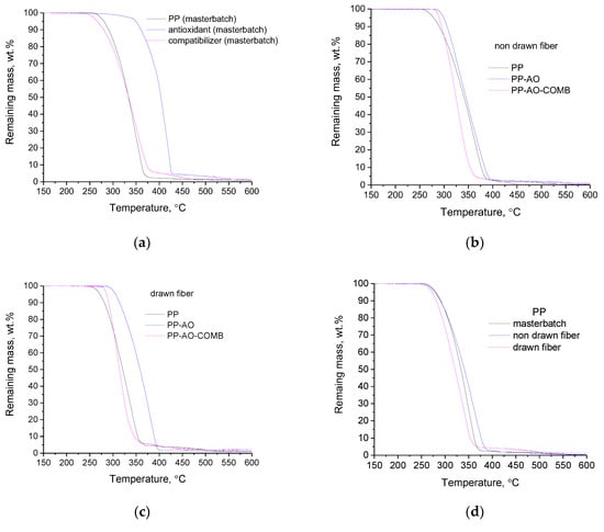 TGA curves of (a) masterbatches; (b) non-drawn filaments; (c) drawn fibers; (d) PP masterbatch, PP non-drawn and PP drawn fibers. Drawing was performed at 120 °C.