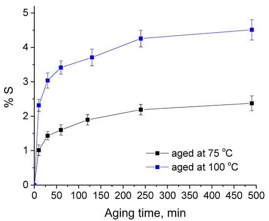 In Figure 3, the percentage degree of shrinking (% S), as a function of time, is presented for PP drawn fibers (at 120 °C) aged at two different temperatures (75 and 100 °C). As can be seen, the trend of the two curves is qualitatively the same at the two aging temperatures. Precisely, within 30 min of aging, shrinking proceeded rapidly and, in up to 4 h (240 min), almost reached its maximum value. Quantitatively, the shrinking at the higher temperature was higher and almost double than the one at 75 °C.