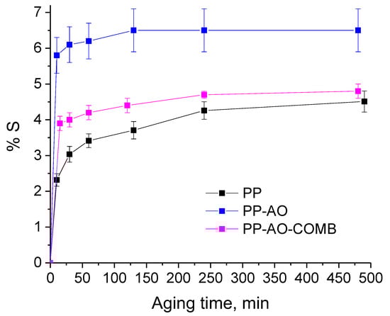 % Degree of shrinking (% S) of PP, PP-AO and PP-AO-COMB drawn fibers (drawn at 120 °C) aged at 100 °C, as a function of the aging time.