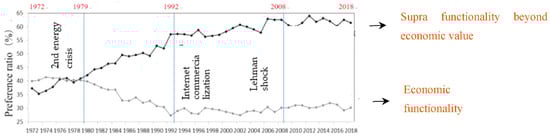 The trend in the shift of people’s preferences in Japan (1972–2018). Source: National Survey of Lifestyle Preferences [50].