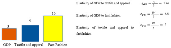 The recent COVID-19 pandemic exerted a shock on the global economy. However, despite this crisis, the fashion industry has been an engine of economic growth. Historically, the fashion industry, including textiles and apparel, has been a method for industrializing. For example, the market size of the global fashion industry improved substantially from USD 1.05 trillion in 2011 to USD 1.25 trillion in 2015, USD 1.40 trillion in 2017, and USD 1.65 trillion in 2020 (40% is shared by the EU and the US) [52]. It developed more rapidly than the global economy: in contrast to the average growth rate of 2.70% in the global gross domestic product (GDP) from 2011 to 2015, the global apparel market increased by 4.70% in the same period. The fast fashion industry established a larger increase (10.0%) during this period, as shown in Figure 4. The GDP elasticity to fashion (1% increase in GDP increases % increase in fashion) is more than double the GDP elasticity of textile and apparel, as shown in the right of Figure 4.