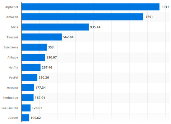 - Clement, J. Market Value of the Largest Internet Companies Worldwide 2022. Statista. 2022. Available online: https://www.statista.com/statistics/277483/market-value-of-the-largest-internet-companies-worldwide/ (accessed on 13 September 2022).