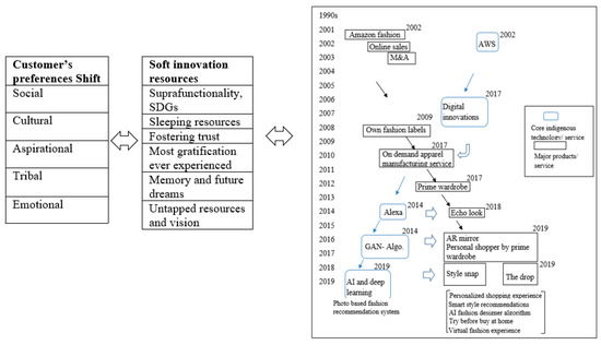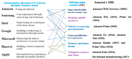 Amazon also absorbs soft innovation resources (SIRs) from external sources and incorporates them into its business model, which converts “routine or periodic alterations” of business activities into “significant improvement” [32,67]. Thus, user-driven innovation accelerates the co-emergence of SIRs enabled by the advancement of the internet and communication technologies in the digital economy.