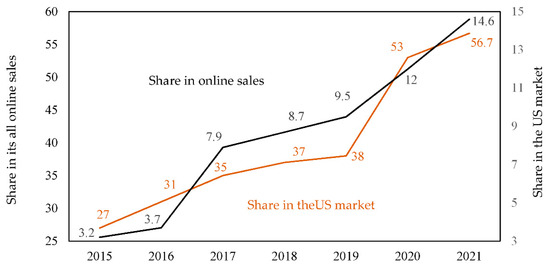 This was not Amazon’s first attempt to break into the luxury fashion market. The company tried similar moves in 2007 with endless.com and in 2012, when endless.com was renamed Amazon Fashion [69]. The increasing share of apparel sales in all of Amazon’s online sales, as well as in the U.S. market, is shown in Figure 9. Among other business lines in 2018–2019, Amazon fashion was the most profitable business, with a 9.5% share in 2019. Amazon emerged as a leader in fashion sales in 2019. Since then, the company has maintained its leadership, with a 56.7% share of the U.S. market and a 14.6% share in online sales during 2021–2022.