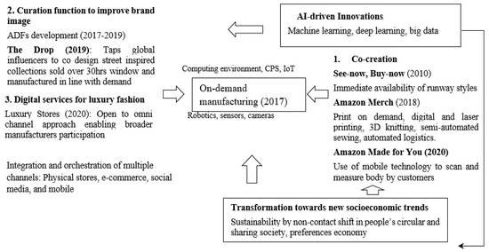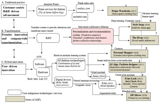 By developing core AI-, IoT-, virtual- and augmented-reality-based digital tools, and mobile devices as reviewed in Section 3.2 and Table 2, Amazon has presented numerous innovations intended to advance its fashion-driven apparel business by using its big data collection system, user-driven innovation, and advanced logistics system, as illustrated in Table 1.