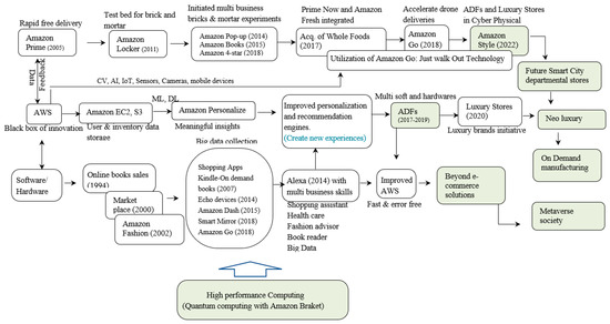 Amazon develops its business empire by undertaking frontier innovation and companywide experimentation based on heavy investments in “technology and content” that generates a big data collection system enabling it to harness the power of users which functions as a virtuous cycle leading to the transformation of “routine or periodic alterations” into “significant improvement” during the R&D process [27]. For example, recently, a few studies have suggested that Amazon’s strength lies in artificial intelligence, whereas Amazon web services (AWS) are a locomotive for AI-driven innovations reflecting sociocultural, economic, and technological changes in society [29,30,31].