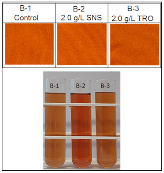 Dyeing tests were performed at 120 °C for 30 min, with 1% Orange 29 Disperse Dye, with standard (2.0 g·L−1 SNS), control (without dispersant) and 2.0 g·L−1 of TRO. Color strength (K/S) measurements of the dyed polyester mesh samples were taken at four different points with the folded sample, and then an average value was determined. In Figure 5, it is possible to visualize photos of the dyed fabric samples dyed at 120 °C and the residual dyeing solutions.