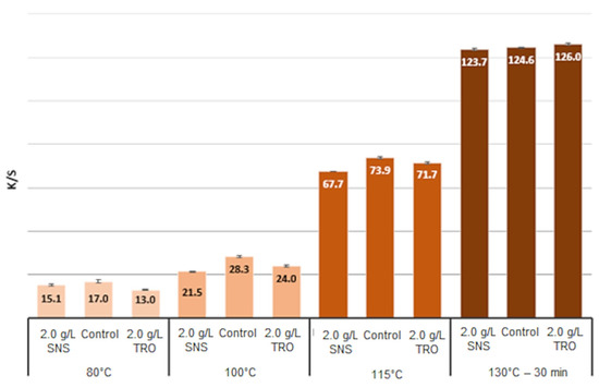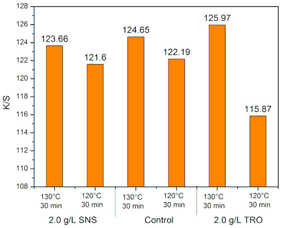 Figure 8 and Figure 9 show the dye adsorbed and K/S values for treatments with 2 g·L−1 of SNS and TRO, along with the control. It is observed that with the increase in temperature, there was greater adsorption of dye and an increase in K/S for the control test and SNS. However, it is also observed that for the control sample at lower temperatures, the adsorption of the dye was greater than the standard.
