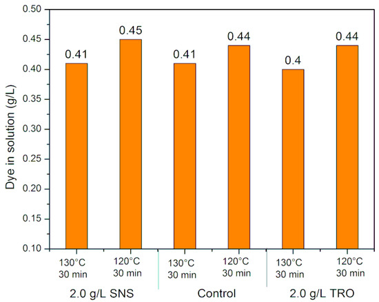 Analyzing the results, it is possible to verify that with the decrease in temperature, there is a loss of K/S, both in the standard treatment with SNS (sodium naphthalene sulfonate—control) and in the treatment with TRO (Turkey red oil). This demonstrates that there is lower dye incorporation with decreasing temperature, which is corroborated by the dye concentration in the residual solution. At 120 °C, there was an increase in the dye concentration in the residual solution.