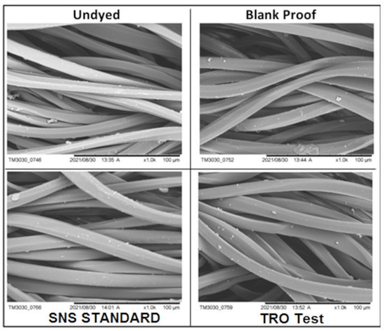 Through the SEM technique, four samples were analyzed: without dyeing, control, SNS standard (2.0 g·L−1 SNS dyed at 130°C—30 min) and TRO test (2.0 g·L−1 TRO dyed at 130 °C—30 min). The images in Figure 10 were obtained with 1000× magnification, making it possible to see that the morphology of the samples is very similar. They present small particles deposited on the fibers, which is probably due to the presence of oligomers. As these particles are evidenced both in the undyed and control samples, as well as in the SNS standard and TRO tested samples, it is evident that both the SNS and the TRO did not show efficiency for the removal of oligomers. In Figure S5, the micrographs are shown at 3000× magnification.