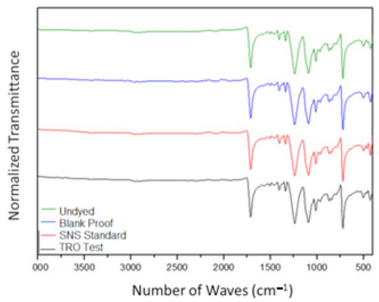 FTIR tests were performed to identify structural characteristics, mainly regarding functional groups and bonds presented in the fabrics. There were four samples tested: without dyeing, control (dyeing without dispersant), standard SNS (dyeing with 2.0 g·L−1 SNS) and TRO test (dyeing with 2.0 g·L−1 TRO), with dyeing performed at 130 °C for 30 min.