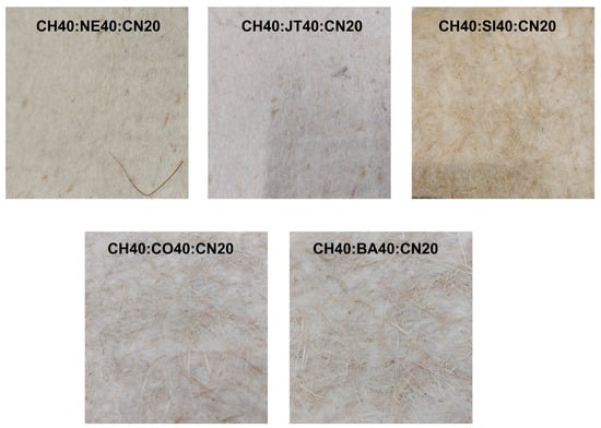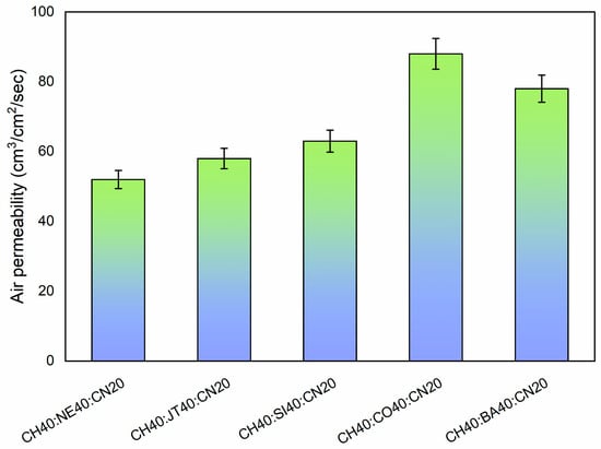 The air permeability of a material is an important attribute that can be used to determine how well it insulates against temperature []. The air permeability of produced non-woven fabric was observed in this work, and the values were found to rely on the mix proportions. For nonwovens like CH40:CO40:CN20 and CH40:BA40:CN20, higher air permeability is shown because both of these materials have thicker fibers, which provides more significant air gaps between fibers in the structure. These gaps enable most of the air to pass through them, leading to higher overall air permeability (Figure 9). The air permeability of the samples CH40:NE40:CN20 and CH40:JT40:CN20 is obviously the lowest. This is because the airflow happens between the pores that make up the structure of the nonwoven fabric. This can be explained as when more pores are present between the fibers that create the structure of the fabric, more open spaces are made available for airflow. This is especially true for fabrics made with coir and banana fibers. On the other hand, the nonwoven fabric that has fewer open spaces between the fibers produces a stronger air drag resistance to airflow than, for instance, the fabric that is formed by employing nettle and jute. The porosity ratio of the nonwoven fabric is determined by a number of distinct characteristics, the most important of which are the fiber qualities, the processing circumstances, the fabric weight, and the fiber density. It is possible to say that the weight of the fabric and the parameters of the production process influenced the porosity property of the samples. This is because the fiber composition of all of the samples is the same. On the other hand, the thickness of the fabric also has an effect on the performance of the air permeability of the fabric. The higher the thickness of the nonwoven fabric (i.e., CH40:CO40:CN20), the longer the path for air passage, which results in a drop in the airflow velocity and vice versa. Therefore, an inverse relationship between thickness and air permeability is postulated to exist. However, in light of the findings of this investigation, it appears that there is a robust and positive correlation.