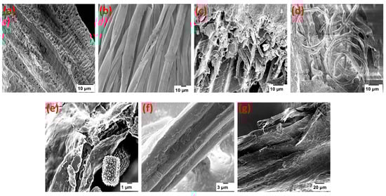 The surface morphology of the nonwoven fabric was characterized by the scanning electron microscope (SEM) as shown in the coffee husk (Figure 3a), cotton (Figure 3b), coir (Figure 3c), banana (Figure 3d), sisal (Figure 3e), jute (Figure 3f), and nettle (Figure 3g). The serrated surface of coffee husk fibers, coir fibers, and banana fibers gives the resulting nonwoven fabric its distinctively rough surface. Fibers extracted from coffee husks have a high roughness, coils, and voids, all of which greatly improve the material’s ability to absorb sound and retain heat. The surface roughness promotes sound absorption properties by increasing the friction between the sound waves. Additionally, the surface area of rough fibers is high which is another reason for the sound absorption property. Overall, the fibers extracted from coffee husk contain bundles of fibrils that cause fibrillation. Generally, fibrillation creates a porous structure that increases the sound absorption property. Surface roughness maximizes the likelihood of the incident acoustic wave being dampened, resulting in increased sound absorption. Microscopic pockets of air are formed by the helix and rough surfaces of the fibers and develop on the fiber surface, resulting in excellent thermal insulation as can be seen in Section 3.4. The thermal and acoustic characteristics of the samples will be addressed in more depth in the following sections. In the case of cotton, nettle and jute proportion in the nonwoven fabric and its fiber fineness, the increase in the quantity of fiber per unit area resulted in an increase in sound absorption (i.e., as compared to the coffee husk). The findings showed that increasing the amount of cotton in nonwoven web improves sound absorption capabilities.
