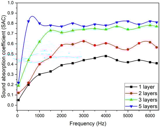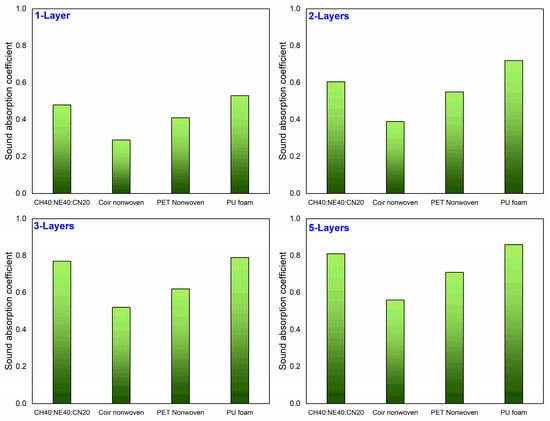 The sound absorption coefficient of the CH40:NE40:CN20 nonwoven fabric and the influence of the number of layers.