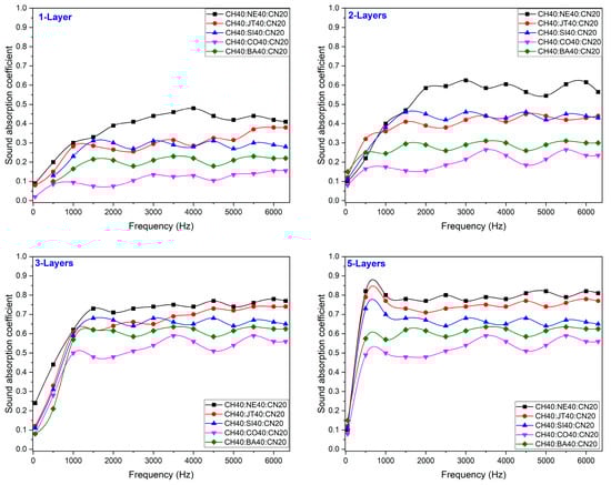 Figure 5 illustrates the influence of the blend proportion as well as the number of layers on the values of the sound absorption coefficient. According to the findings, the overall sound absorption coefficient of the produced nonwoven fabrics is dependent on the proportion of their mix, and this is something that can also be noticed in different numbers of layers. It is possible that frequency has a substantial impact on the sound absorption coefficient as higher frequencies lead to higher levels of sound absorption [,]. Due to the higher proportion of coffee husk along with nettle and jute fibers responsible for sound absorption in both cases, respectively, this pattern was observed in different numbers of layers as well. The nonwoven web with (CH40:NE40:CN20 and CH40:JT40:CN20) has the highest sound absorption coefficient throughout the entire frequency range. A higher fraction of nettle fibers in the blend may yield promising sound absorption coefficient results due to the higher fineness of the nettle fibers when compared to the fineness of the other fibers employed in this investigation. The increased sound absorption coefficient may have three possible explanations, which are as follows: