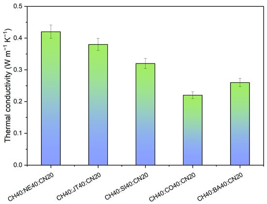 The thermal conductivities of nonwoven fibrous materials have been measured, and the results are given in Figure 8. The thermal conductivities of the fabrics made with CH40:NE40:CN20 and CH40:CO40:CN20 were the highest and lowest, respectively, and the standard deviations displayed by each fabric were satisfactory. It is not always the case that nonwoven fibrous materials maintain the same level of thermal conductivity over time. The nonwoven fibrous material’s density, the amount of moisture that they contain, and the temperature of the surrounding environment are the primary factors that determine its thermal conductivity []. Additional scattering mechanisms, such as voids and cell boundaries of natural fibers such as coffee husk, coir, banana, and sisal, might have an effect on the thermal conductivity of materials that are dense and have a high percentage of porosity. The increase in density, moisture, and temperature of the surroundings all contribute to an increase in thermal conductivity. The helix structure of the coffee husk, banana, and sisal fibers, which were placed in an orderly manner in the framework, helped with both the absorption of sound and the conduction of heat. As a consequence of this finding, it was determined that the predominant route of heat transmission across the coffee husk blended nonwoven fibrous materials is that of conduction. This conduction occurs via the voids and the helical structure. When it comes to the transmission of heat through fabrics, density is, in most cases, the single most essential factor.