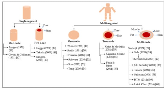 Thermophysiological comfort models can be classified into two main categories depending on the number of segments representing the body parts []: (a) single-segment and (b) multi-segment. The single-segment predictive model considers the entire human body as a whole. In contrast, the multi-segment model considers different body parts separately. Another way to classify thermophysiological comfort models is based on the number of concentric layers: (a) single-node, (b) two-node, and (b) multi-node. A single-node model only considers the core to represent the cross-section of a human body, whereas a two-node model considers the core and skin to represent the cross-section of the human body. In contrast, the multi-node model considers the core, muscles, fat, and skin layers separately. Figure 1 shows the chronology of the development of the different types of thermophysiological comfort prediction models.