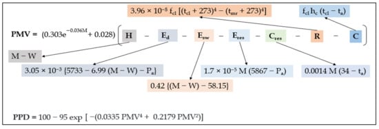 PMV and PPD equations based on the heat balance equation [,]. The different parameters are described in Section 2.