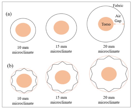 While the microclimate discussed in Ding et al.’s [,] work was horizontal and homogeneous, the microclimate formed between the human skin and the cloth layer is usually heterogeneous and vertical in orientation []. Mert et al. [] investigated the total heat flux in the skin–cloth–environment system using a vertical microclimate. Both homogeneous and heterogeneous microclimates were created to conduct the study. In the case of the homogeneous vertical microclimate, the distance between the single-sector sweating cylindrical torso (i.e., skin) and the surrounding cloth layer was kept the same (Figure 3a). On the other hand, the heterogeneous air gap was created by folding the fabric at various frequencies (Figure 3b). The study found that the total heat of the system decreased with the increase in microclimate thickness. Neither their experimental results nor theoretical calculations showed any clear evidence of the onset of natural convection. Natural convection in a vertical microclimate starts when the buoyancy force overcomes the fluid resistance []. Mert et al.’s [] study also found that the number of folds increased the amount of total heat loss in the skin–clothing–environment system. Santos et al. [] developed a numerical heat transfer model in 2D cylindrical microclimates implementing forced convection from the ambient air to the cloth outer surface for a Reynold number of 3900. They suggested that the airflow inside the microclimate regime depended on the air velocity of the ambient air, a characteristic length corresponding to the microclimate thickness, and the porosity of the fabric. The airflow inside the microclimate was estimated to be laminar when the fabric porosity was such that it kept the microclimate air velocity < 0.16 m/s and the characteristic length of the fluid flow < 20 mm.