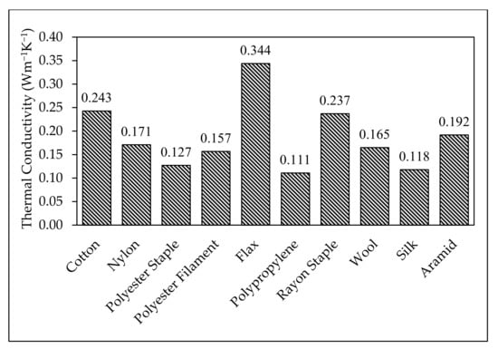The crystallinity of fibers also affects their thermal properties, such as thermal conductivity, specific heat capacity, and heat of sorption []. The heat transfer through the crystalline regions of a fiber occurs through crystal lattice vibrations []. For the amorphous regions, the conductive heat transfer mainly involves the intrachain axial conduction mechanism []. A polymer with a higher degree of crystallinity exhibits a higher thermal conductivity than a polymer with a lower degree of crystallinity []. For instance, the thermal conductivity of polyester fibers is usually lower than that of cotton, which has been attributed to the lower degree of crystallinity of the PET polymer []. In addition, the free volume in the amorphous regions of low-density polymers causes their low thermal conductivity. Figure 4 provides a comparison of the thermal conductivity of different textile fibers.