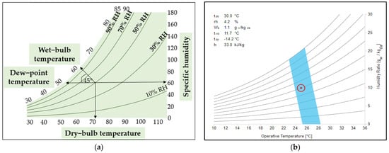 Fanger’s thermophysiological comfort prediction model consists of three steps []: (a) determination of the thermal stress level using the predicted mean vote (PMV) and predicted percentage of dissatisfied (PPD), (b) calculation of the equivalent temperature, and (c) evaluation of thermal comfort based on subjective assessment. The PMV and PPV indices are estimated from the basal metabolism (M), heat produced by work (W), clothing surface temperature (tcl), clothing insulation (Icl), clothing cover factor (fcl), air temperature (Ta), relative humidity of air (RHa), mean radiant temperature (Tmr), and convective heat transfer coefficient (hr). The PMV values range from −3 to +3, mimicking a 7-point Likert scale, where −3 represents very cold, −2 represents cold, −1 represents slightly cold, 0 represents neutral, 1 represents slightly warm, 2 represents warm, and 3 represents very warm. When the PMV is −0.5 to +0.5, the PPD is 10%. This indicates that 10% of the participants are in discomfort. It is to be noted that discrepancies have been documented between PMV results and thermal sensation from wear trials []. They are possibly due to issues with the determination of tcl.