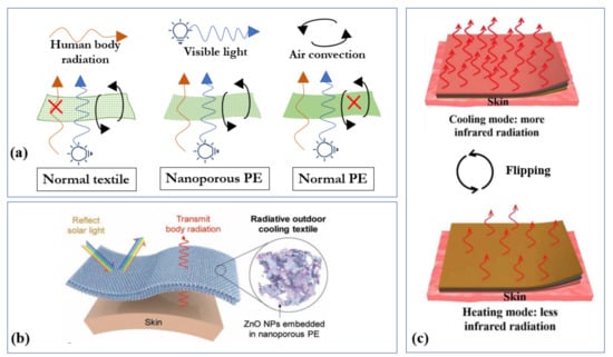 - Cai, L.; Song, A.Y.; Wu, P.; Hsu, P.-C.; Peng, Y.; Chen, J.; Liu, C.; Catrysse, P.B.; Liu, Y.; Yang, A.; et al. Warming up Human Body by Nanoporous Metallized Polyethylene Textile. Nat. Commun. 2017, 8, 496. [Google Scholar] [CrossRef]