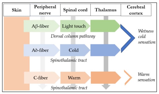 - Campero, M.; Bostock, H. Unmyelinated Afferents in Human Skin and Their Responsiveness to Low Temperature. Neurosci. Lett. 2010, 470, 188–192. [Google Scholar] [CrossRef]