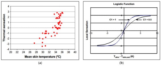 Human body thermophysiological comfort arises from the thermoregulation process []. Thermoregulation causes the generation of heat and sweat to maintain a constant core body temperature of 37.0 ± 0.5 °C under various exposure conditions []. The thermoregulation process is complex and depends on various physiological and environmental parameters. The main thermoregulation-controlling point of the human body is the hypothalamus []. It is a gland in the brain that receives signals from (a) peripheral nerves and (b) blood particles (due to their movement in the hypothalamus area) []. The peripheral nerves collect signals from warm and cold receptors of the cutaneous sensory layer. The warm and cold receptors can sense temperature changes as little as 0.007 °C and 0.012 °C, respectively.