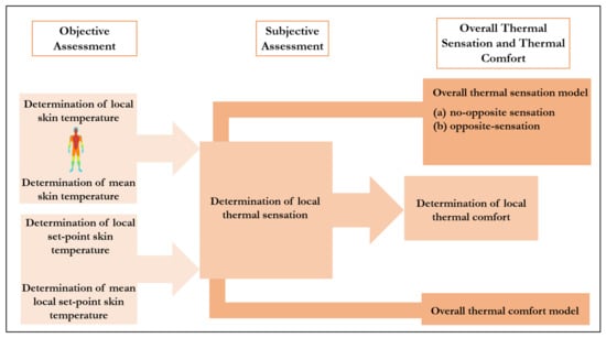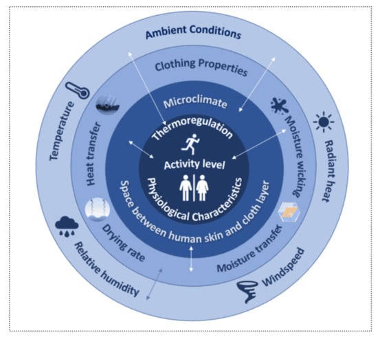 The human thermophysiological comfort models thus depend on a wide variety of interconnected factors, which makes it difficult to predict the precise level of thermal comfort of an individual under a given condition []. The next sections describe several aspects of thermophysiological comfort modeling, including the conceptual ground for model development, the physics of heat and moisture transfer in the skin–clothing–environment system, factors controlling thermophysiological comfort, and assessment techniques.