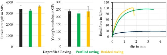 - Penzel, P.; May, M.; Hahn, L.; Scheerer, S.; Michler, H.; Butler, M.; Waldmann, M.; Curbach, M.; Cherif, C.; Mechtcherine, V. Bond Modification of Carbon Rovings through Profiling. Materials 2022, 15, 5581. [Google Scholar] [CrossRef]