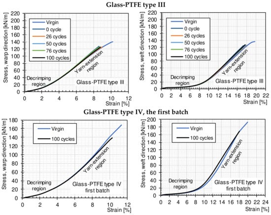The results of the investigations into the mechanical performance of glass-PTFE fabrics under up to 100 freeze–thaw cycles have been achieved by uniaxial tensile testing. The mean stress–strain curves obtained from three to five specimens of glass-PTFE types III and IV, as illustrated in Figure 9, reveal an unaltered overall pattern in the decrimping and yarn-extension regions after exposure to freeze–thaw cycles. However, they exhibit lower breaking strength compared to the virgin (initial dry) strips.
