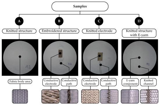 Schematic presentation of the sample groups and sub-groups used in this study with microscope images of the areas examined in detail. A photograph of the complete sample is shown on the top. (A) Knitted structure. This is a plain knitted structure without any embedded electronics. (B) Embroidered structure. This is a knitted structure with an electrode and conductive interconnections embroidered onto it. (C) Knitted electrode. This is a knitted textile where a knitted electrode and interconnections are incorporated as part of the knitting process. (D) Knitted structure with E-yarn. This is a knitted structure created with a channel into which an electronic yarn has been inserted.