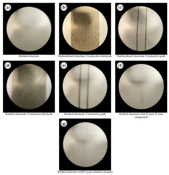 After positioning the sample with the clamp mechanism, it was checked for any sign of deformations or wrinkles. Subsequently, the airflow was automatically increased for the test until it reached the target of 100 Pa. At this point, the machine stopped and recorded the airflow rate through the sample in millimeters per second. This process was repeated five times for each sample at the same location, with the results presented in this work being an average measurement. Seven locations on the collective samples were explored: Group A—the center of the knitted samples (Figure 2a); Group B—the center of the sample including the embroidered electrode (Figure 2b) and the embroidered conductive paths (Figure 2c); Group C—the center sample including the knitted electrode (Figure 2d), and also on the knitted conductive path (Figure 2e); and Group D—the center of the sample, which includes the E-yarn component (Figure 2f), as well as the knitted channel holding the E-yarn and the interconnections running to the component (Figure 2g).
