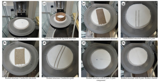 Following cutting, samples were conditioned at approximately 23 °C for 24 h. The test procedure consisted of weighing the sample in the dry state and during the wetting process. The sample was placed on the porous plate and a mesh structure weighing 7 g was placed on top of it to achieve better contact (shown in Figure 5c for the plain knitted sample; each of the positioned samples is shown in Figure 5a,b,d–h to show the exact area of the samples tested).