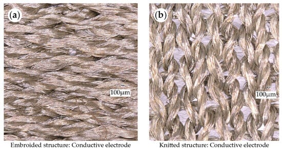 Microscope images of the electrodes investigated in this study. (a) Embroidered electrode. (b) Knitted electrode.