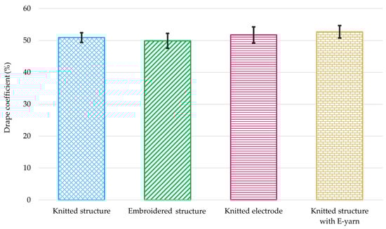 The drape coefficient of the samples varied between 49.88 ± 2.34% and 52.69 ± 1.95%. Hence, no significant differences were observed between the samples, and any minor discrepancies can be attributed to variations in the overall weight of the fabric. The relative errors (Table A5) show a variation between 1.65 and 3.50%. When electronics were added to the base fabric, it was expected that the drapability would differ due to differences in weight, structure, materials, and thickness.
