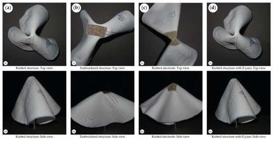 Multiple techniques for integrating electronic functionality with textiles have been explored over the years including attaching electronics, printing electronics, weaving conducting elements, and incorporating functional yarns. These methods have generally been developed to improve the level of integration into the textile or enhance one of its properties (such as durability). The three example E-textiles chosen for this work were used as they cover an array of E-textile construction techniques that are believed to result in fairly normal textile properties and represent examples of construction techniques previously employed by the research group [18,19,20]. In terms of design, the textile electrodes are similar in size and shape for both the embroidered and knitted samples to allow for a better comparison. Within a sportswear context, electrodes are commonly used for heart rate monitoring. E-yarns were employed for measuring the skin temperature of athletes in a previous study [20].