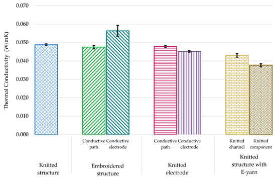 The embroidered electrode had the highest thermal conductivity of 0.056 ± 0.003 W/mK; this was likely due to the high conductivity of silver-coated yarn, which is more thermally conductive than polyester. Conversely, the knitted conductive electrode had a slightly lower conductivity than the base plain knitted fabric of 0.045 ± 0.0004 W/mK. This was believed to be due to its porous and slightly thinner structure than the embroidered electrode despite using the same silver-coated yarn. The lowest conductivity was observed for the sample containing the E-yarn component where a conductivity of 0.038 ± 0.001 W/mK was observed. This suggests that the presence of the component slightly restricted the heat flow in this location. However, the result was still in the same order as the plain knitted structure (k = 0.049 ± 0.001 W/mK). This gave a relative error of 42.34% (see Table A6). It is worth mentioning that the thermal conductivity range of 0.035 to 0.9 W/mK for dry textile fabric is mentioned in the literature [39], so while the addition of the E-yarn did decrease the thermal conductivity, the resultant textile still had thermal characteristics in a normal range.