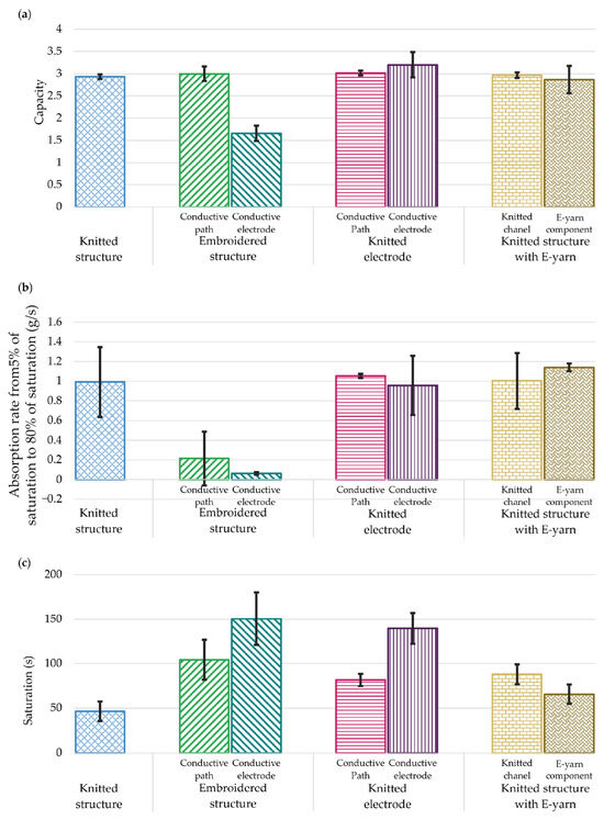 Overall, due to having a high density and low porose structure, the embroidered conductive electrode had the lowest capacity (1.66 ± 0.17), lowest average rate (0.06 ± 0.01 g/s), and the highest saturation time (150.4 ± 29.6 s) (relative errors 43.68% and 93.94, respectively, see Table A7 and Table A8). Conversely, there are no significant differences between the capacities of the remaining samples (2.87 ± 0.31–3.20 ± 0.28). With the exception of the conductive tracks of the embroidered electrode, where the average rate was 0.22 ± 0.27 g/s (the high variation was due to results from a single sample), only minor differences in average rates were observed for the other sub-groups (0.96 ± 0.30–1.14 ± 0.04). The saturation time showed significant differences between the sub-groups, with the knitted structure having the lowest time at 46.43 ± 10.92 s. High saturation times were seen for both the embroidered electrode (150.44 ± 29.60 s; relative error 224.85%, see Table A9) and knitted electrode (139.64 ± 17.48 s; relative error 200.03%, see Table A9), possibly due to the conductive elements having a poor moisture uptake.