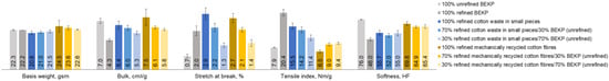 Figure 6 show the rearranged results of the physical-mechanical properties of the nonwovens produced, allowing us to better understand the impact of using the two different cotton waste matrixes in blends with unrefined and refined BEKP, respectively. Comparing refined cotton waste in small pieces with refined mechanically recycled cotton fibres, the use of small pieces resulted in higher tensile index, but lower softness (