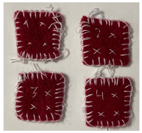 To investigate the effect of washing wool fabric with the prepared laundry gels and softeners on wool fiber restoration, red-colored wool fabric was used (Figure 1). The fabric was cut into 2 cm × 2 cm pieces for the convenience of further SEM investigation. The samples were stitched with cotton threads to maintain their integrity and for labeling. A total of 8 wool samples, cut from the same wool textile piece, were used.